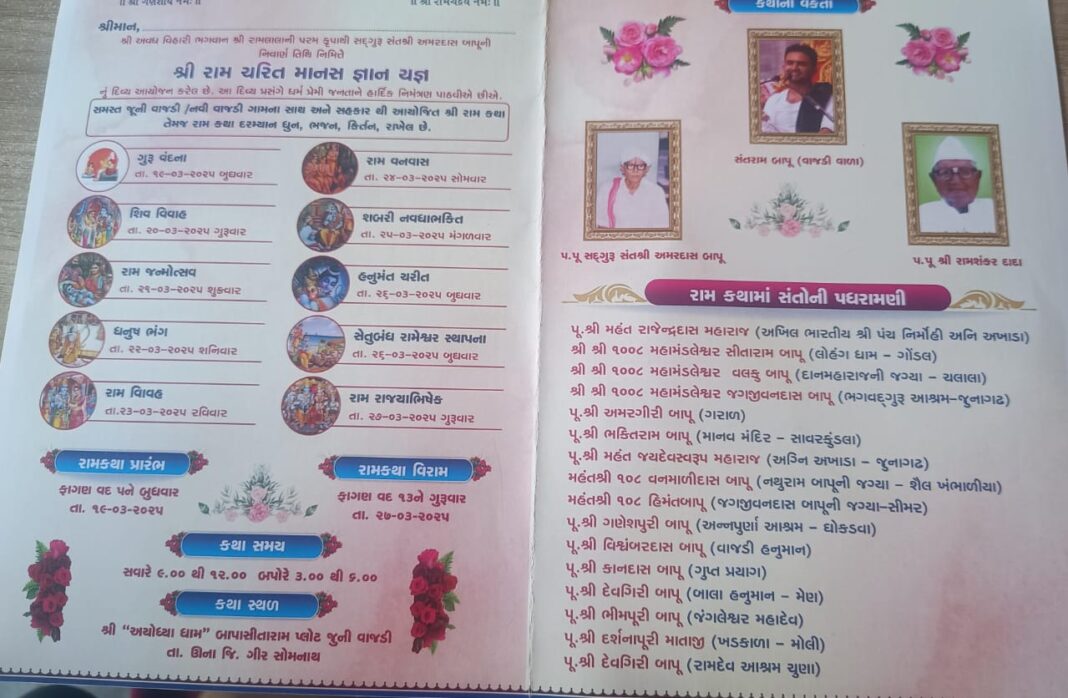 ઉના તાલુકાના જૂની વાજડી ગામે શ્રી “અયોધ્યા ધામ ” બાપા સીતારામ પ્લોટ જુની વાજડી ખાતે શ્રી અવધવિહારી ભગવાન શ્રીરામ લાલાની પરમ કૃપાથી સદગુરુ સંત અમરદાસ બાપુ નિર્વાણ તિથિ નિમિત્તે શ્રી રામચરિત માનસ જ્ઞાન યજ્ઞનું ભવ્ય આયોજન કરેલ છે.આ દિવ્ય પ્રસંગે ધર્મ પ્રેમી જનતાને હાર્દિક નિમંત્રણ પાઠવવામાં આવેલું છે. આ જ્ઞાનયજ્ઞમાં સમસ્ત જુની વાજડી, નવી વાજળી ગામના સાથ સહકારથી ભવ્ય આયોજન કરવામાં આવ્યું છે. આ જ્ઞાન યજ્ઞમાં ગુરુ વંદના ,રામ વનવાસ ,શબરી નવધા ભક્તિ,રામ જન્મોત્સવ, હનુંમાનચરિત ,ધનુષભંગ, સેતુબંધ રામેશ્વર સ્થાપના,રામ વિવાહ, રામ રાજાભિષેક એવા પ્રસંગો યોજાશે.કથાનો પ્રારંભ ફાગણ વદ પાંચમને બુધવાર તારીખ ૧૯/૦૩/૨૦૨૫ થી ફાગણ વદ તેરસને ગુરુવારે ૨૭/૦૩/૨૫ ના રોજ રામકથા નો વિરામ થશે.કથાનો સમય સવારે ૯ થી ૧૨ અને બપોરે ૩ થી ૬ નું આયોજન કરવામાં આવેલું છે.આ તકે આયોજક શ્રી સાધુ શ્રી મનસુખદાસ બાપુ ગોંડલીયા એ તમામ રામ ભક્તો અને સનાતન ધર્મ પ્રેમીઓ ને આ કથા માં આવવા જાહેર આમંત્રણ પાઠવેલ છે.તો દરેક ધર્મ પ્રેમીઓ આ રામ કથા નો લાભ લે.