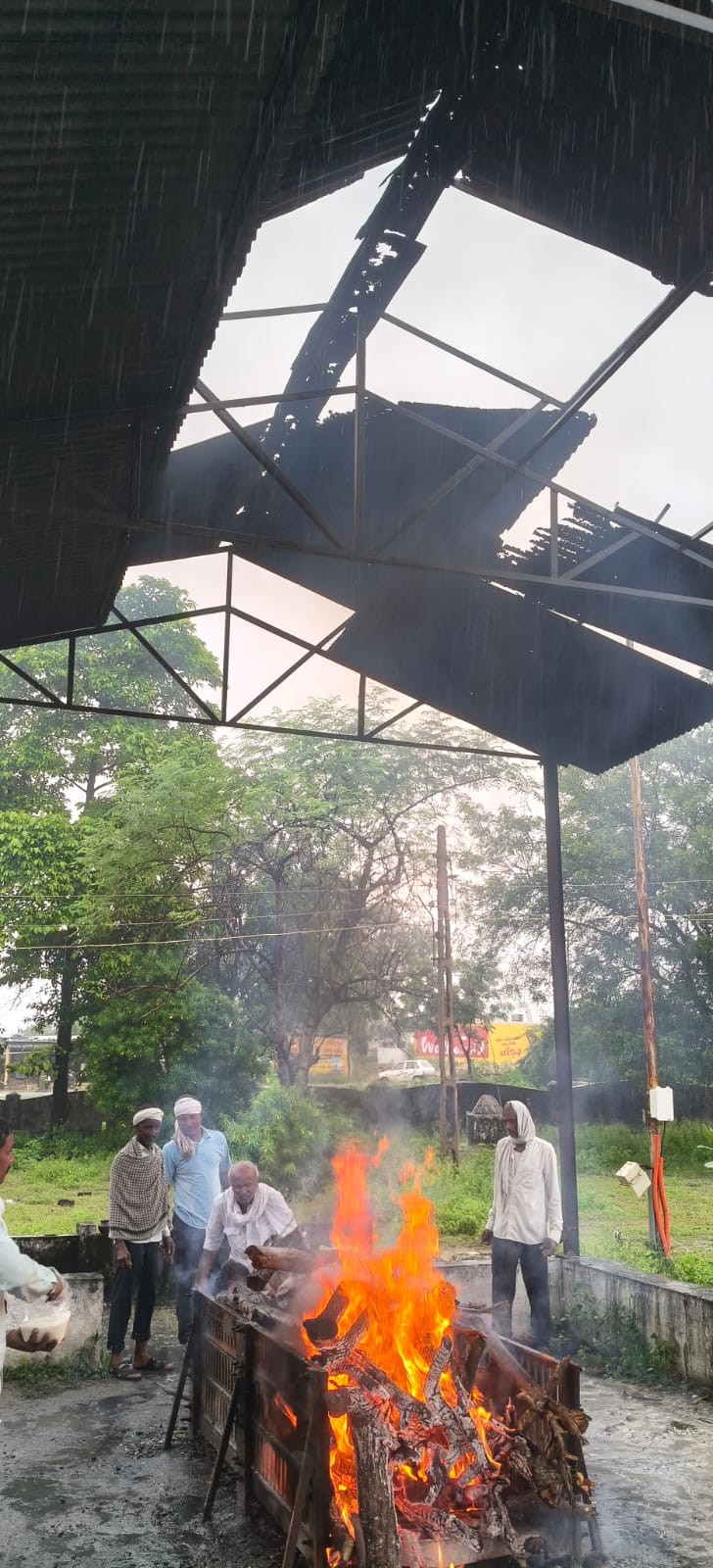 વડાલીમાં સ્મશાન ગૃહમાં લગાવેલ પતરા ઉડી જતા ચાલુ વરસાદમાં મૃતદેહને જ્વલનશીલ પ્રવાહી થી બાળવાની નોબત આવી