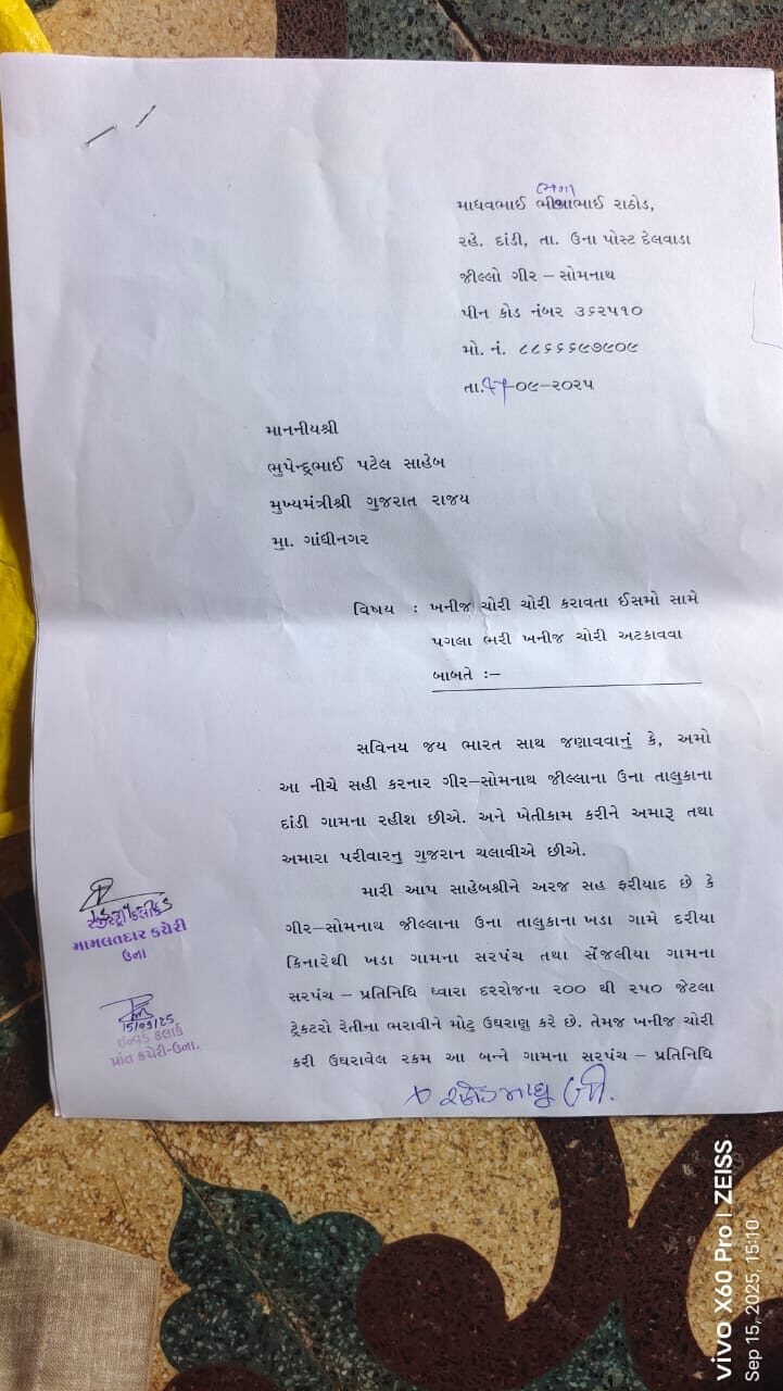 ઉના તાલુકાના ખડા ગામ એ રાત્રિ ના અંધકાર મા ચાલતા રેતી ચોરી અંગે ની રજૂઆત ઉના તાલુકાના દાંડી ગામ ના સામાજિક કાર્યકર શ્રી માધવભાઇ ભગાભાઇ રાઠોડ દ્રારા મુખ્યમંત્રી તથા ખાણ ખનીજ મંત્રી તથા જીલ્લા કલેકટર ગિર સોમનાથ તેમજ પોલીસ વડા શ્રી ગિર સોમનાથ ને કરવા મા આવી છે સામાજિક કાર્યકર માધવભાઇ એ પોતાની રજૂઆત મા ખડા ગામ ના સરપંચ તથા સેજળિયા ગામના સરપંચ પ્રતિનિધિ શ્રી ઉપર રેતી ઉપર મોટી રકમની ઉઘરાણી કરાતો હોવાનો આક્ષેપ પણ કર્યો છે સાથે સાથે રજુઆત મા એવુ પણ જણાવે છે કે વન વિભાગ દ્વારા લૃપ્ત તા ને આરે આવેલ અને વાઇલ્ડ લાઇફ દ્રારા રક્ષિત જાહેર કરાયેલ દરિયાઇ કાચબાની ની જાતો પૈકી ઓલીવરીડલી તેમજ સીટટલ જાતી ના કાચબા આ રેતી મા પોતાના માળા બનાવી ઇંડા મૂકે છે પરંતુ આ દરિયા કિનારે થી રેતી ખનન થતું હોય જેથી આ રક્ષિત જાહેર કરાયેલ દરિયાઇ કાચબા પણ ખતરા મા છે વળી દરિયા કિનારે નંબર પ્લેટ વગર ના ટ્રેક્ટર તથા જેસીબી ના ઉપયોગ થકી આ રેતી ભરાય છે અને બેફામ પુરપાટ ઝડપે ટ્રેક્ટર ચલાવી આજુબાજુ ના રહિશો ઉપર પણ જીવનું જોખમ ઉભું કરવામાં આવે છે તથા આ રેતી ભરવા આવતા ટ્રેક્ટર ચાલકો પાસે થી કોઈ પણ પ્રકારની લીઝ ના હોવા છતાં ખડા તેમજ સેજળિયા ગામ ના સરપંચ તથા સરપંચ પ્રતિનિધિ દ્રારા ઉઘરાણુ કરવા આવે છે