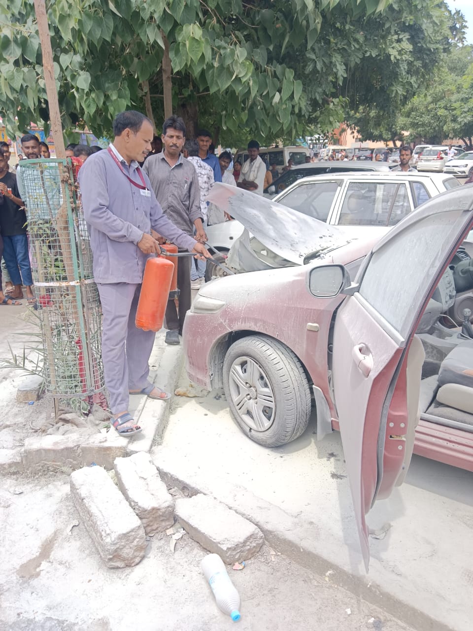 ગાડીમાં અગમ્ય કારણોસર આગ લાગતા મંદિરનો સ્ટાફ આજુબાજુ દુકાનવાળા તેમજ ફાયર બ્રિગેડ ની સતર્કતા થી આગને કાબુમાં લેવાઇ હતી