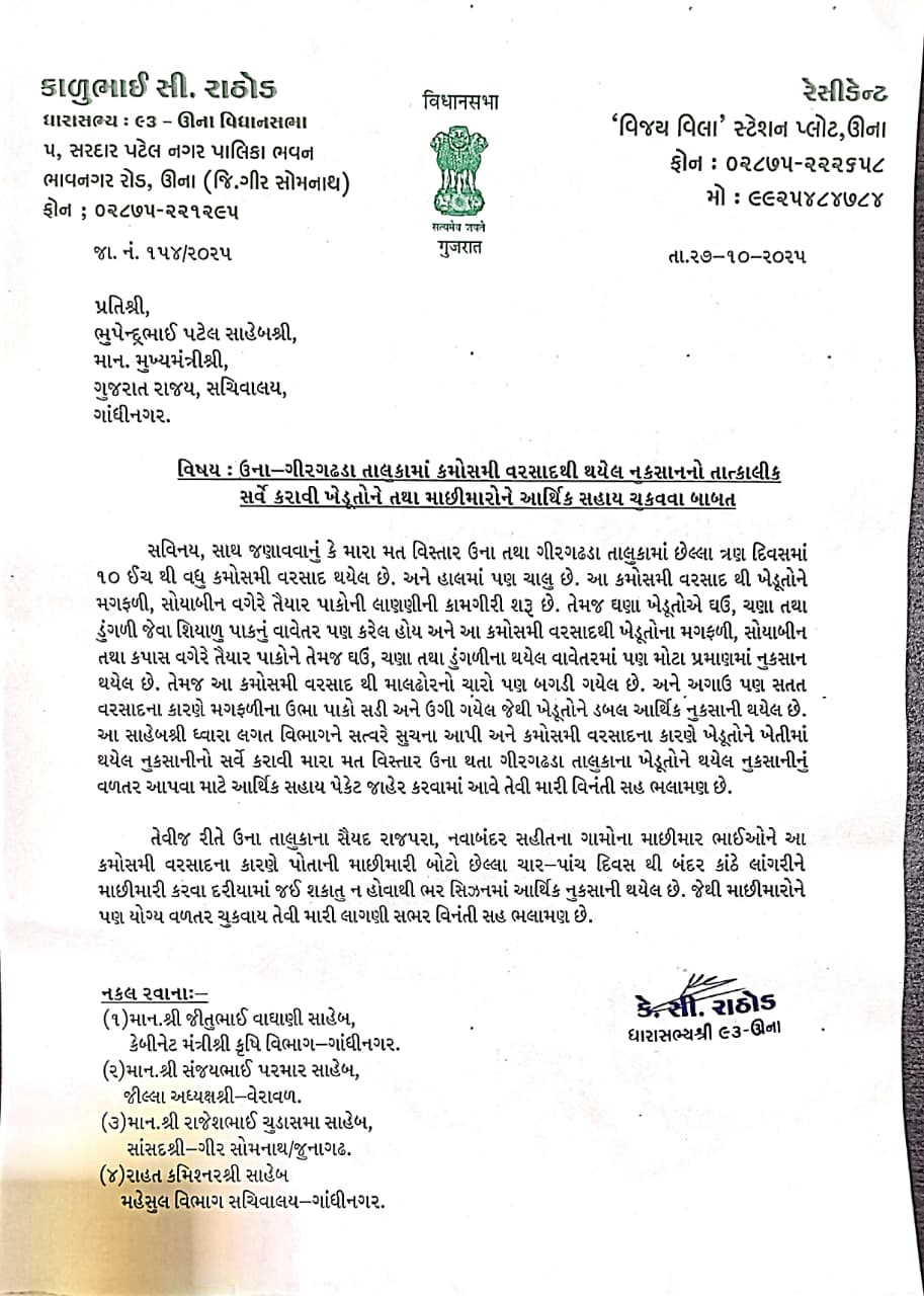 ઉના વિધાનસભા મતવિસ્તાર ના ઉના તથા ગિર ગઢડા તાલુકાના ખેડૂતો તથા ઉના તાલુકાના સૈયદ રાજપરા તેમજ નવાબંદર ગામ ના માછીમારો ને થયેલા નુકસાનની સામે વળતર ચુકવવા ધારાસભ્ય શ્રી કાળુભાઇ રાઠોડ એ રાજ્ય ના મુખ્ય મંત્રી શ્રી ભુપેન્દ્રભાઈ પટેલ ને પત્ર લખીને ખેડૂતો તથા માછીમારો માટે ખાસ આર્થિક પેકેજ જાહેર કરવા માંગ કરી છે