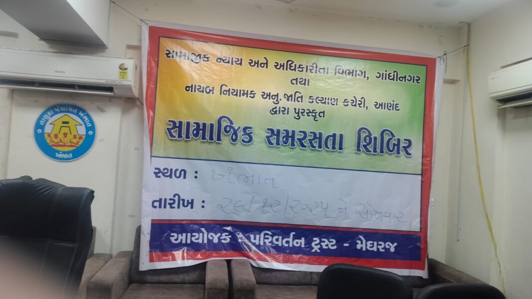 અનુસૂચિત જાતિ કલ્યાણ ખાતા પુરસ્કૃત પરિવર્તન ટ્રસ્ટ મેઘરજ દ્વારા આણંદ જિલ્લાના ખંભાત તાલુકાના તાલુકા પંચાયત ના હોલ માં સામાજિક સમરસતા શિબિર યોજાઈ.