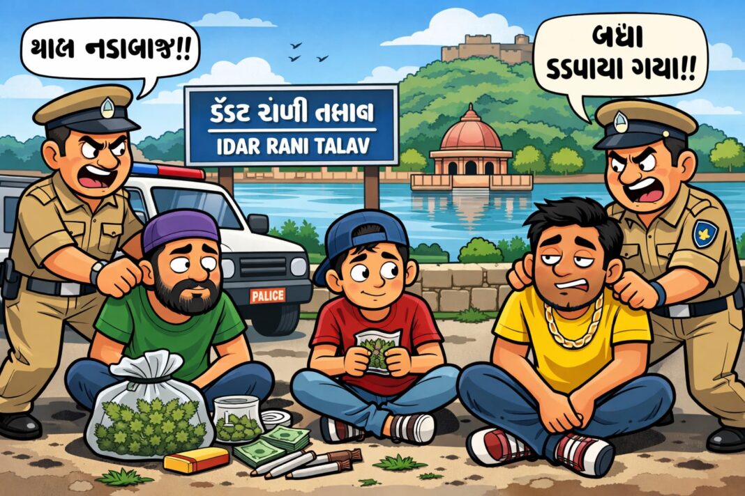 દરમીયાન તા.૨૯/૧૨/૨૦૨૫ ના રોજ વી.આર.ચૌહાણ પોલીસ સબ ઇન્સ્પેકટર તથા ઈડર પોસ્ટેના સર્વેલન્સ સ્કોડના આ.હે.કો.કીરીટસિંહ રજનીકાંતસિહ તથા પો.કો. નિકુલસિંહ મહેન્દ્રસિંહ તથા જયદીપસિંહ નરેન્દ્રસિંહ તથા પો.કો.હાર્દિકકુમાર લાલાભાઈ નાઓ ૩૧ મી ડીસેમ્બર ૨૦૨૫ ને અનુલક્ષીને ખાનગી વાહનમા પો.સ્ટે વિસ્તારમા પેટ્રોલીંગમા હતા અને પેટ્રોલીંગ ફરતા ફરતા વિજયનગર ત્રણ રસ્તાથી ઈડર તરફ આવી રહેલ હતા દરમ્યાન ઈડર રાણી તળાવ કવીન્સ લેક હોટલ સામે રોડની સાઈડમા ત્રણ ઈસમો કોલેજ બેગ સાથે શંકાસ્પદ હાલતમાં ઉભા હોય જેથી અમોએ ખાનગી વાહન ઉભુ રખાવી નીચે ઉતરી સદરી ઇસમો પુછ પરછ કરતા ત્રણેય ઇસમના નામઠામ પુછતા પોતે પોતાના નામ (૧) જીગર લાલચંદ પારઘી રહે.ધોડામારી તા. કોટડા છાવણી જી.ઉદેપુર રાજસ્થાન (૨) સુનીલ ચંદુભાઈ રાવળ હાલ રહે.કપુરી ચોક ડો.મુકુદભાઈ દવેના દવાખાનાની પાસે, માણસા તા.માણસા જી.ગાંધીનગર મુળ રહે.લાંઘણજ તા.જી.મહેસાણા (૩) કાયદાના સંઘર્ષમાં આવેલ કિશોર નો હોવાનું જણાઈ આવતાં આરોપી નં-૧ પાસે થી થેલો જોતા કાળા તથા ગુલાબી કલરનો સ્કુલ બેગ ખોલી જોતા તેની અંદર પ્લાસ્ટીકના ગમ પટા થી વીટાળેલ બે પેકેટ મળી આવેલ જે પેકેટ ખોલી તેમા રહેલ પદાર્થ જોતા વનસ્પતિજન્ય ગાંજા વગર પાસ પરમીટે માદક પદાર્થ ગાંજો જેનું વજન ૩.૦૨૧ કિલો ગ્રામ કિમત રુ. ૧,૫૧,૦૫૦ /- મળી આવતાં ત્રણેયની પુછ-પરછ કરતાં આરોપી નં-૧ નાએ સદર ગાંજો પોતાના ઘરે ઉગાડી માદક પદાર્થ ગાંજાનો જથ્થો આરોપી નં-૨ નાને આપવાનો હોઇ જે રોકડ રકમ ૧૪,૭૦૦/- તથા મોબાઈલ નંગ ૦૩ કિમત રૂપીયા ૧૫,૦૦૦/- નો મૂદામાલ કબ્જે કરી આરોપીઓ તથા કાયદાના સંઘર્ષમાં આવેલ કિશોર વિરુધ્ધ ઇડર પોલીસ સ્ટેશન બી પાર્ટ ઘી નાર્કોટિક ડ્રગ્સ અને સાયકોટ્રોપીક સબસ્ટન્સિઝ એક્ટ-૧૯૮૫ (એન.ડી.પી.એસ.એકટ)ની કલમ ૮(સી) ૨૦ (બી), ૨૯ તથા જુવેનાઈલ જસ્ટીસ એકટ ૨૦૧૫ ની કલમ ૭૮ મુજબનો ગુન્હો રજી કરી આગળની તપાસ કાર્યવાહી કરવામાં આવી રહેલ છે.