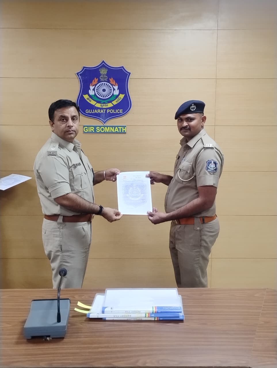 ગિર સોમનાથ જિલ્લા પોલીસ વડા જયદિપસિંહ જાડેજા એ પોલીસ કર્મચારી ને પ્રશંસા પત્ર આપી કરીયુ સન્માન