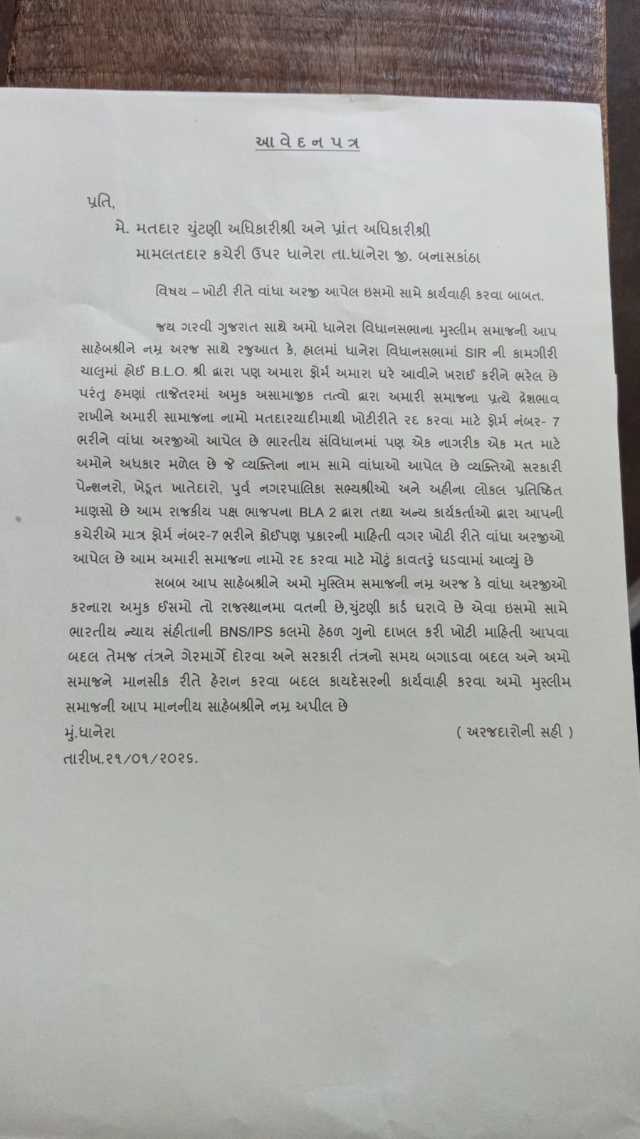 આપ સાહેબ શ્રી અમો મુસ્લિમ નમ્ર અરજ કે વાંધા અરજી કરનાર અમુક ઈસમો તો રાજસ્થાન ના વતની છે અને ચુંટણી કાર્ડ ધરાવે છે આવા ઈસમો સામે ભારતીય ન્યાય સહિતા ની BNS/IPS કલમો હેઠળ ગુનો દાખલ કરી ખોટી માહિતી આપવા બદલ તેમજ તંત્ર ને ગેરમાર્ગે દોરવા અને સરકારી તંત્ર નો સમય બગાડવા બદલ અમો સમાજને માનસિક રીતે હેરાન કરવા બદલ કાયદેસરની કાર્યવાહી કરવા અમો મુસ્લિમ સમાજ ની આપ માનનીય સાહેબ ને નમ્ર અપીલ છે