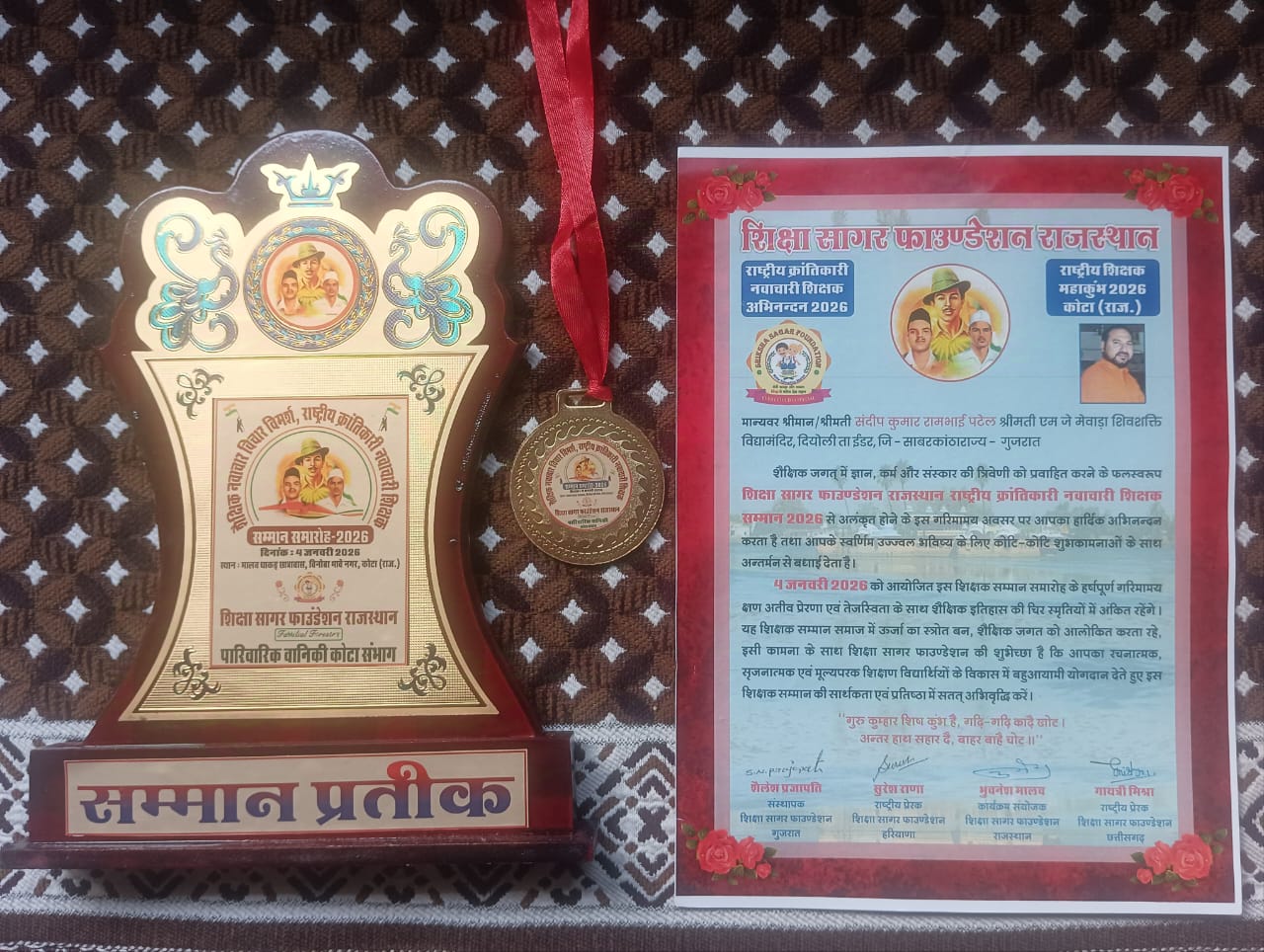 ગુજરાત રાજ્યના સાબરકાંઠા જિલ્લાના ઈડર તાલુકાનું નામ શિક્ષણ જગતમાં રાષ્ટ્રીય સ્તરે રોશન થયું છે. ઈડરની શ્રીમતી એમ. જે. મેવાડા શિવશક્તિ વિદ્યામંદિર, દિયોલી ખાતે ફરજ બજાવતા વિજ્ઞાન શિક્ષક, જાણીતા કવિ અને લેખક સંદીપ પટેલ “કસક” ને રાજસ્થાનના કોટામાં ‘રાષ્ટ્રીય ક્રાંતિકારી નવાચારી શિક્ષક સન્માન-૨૦૨૬’થી સન્માનિત કરવામાં આવ્યા છે.
