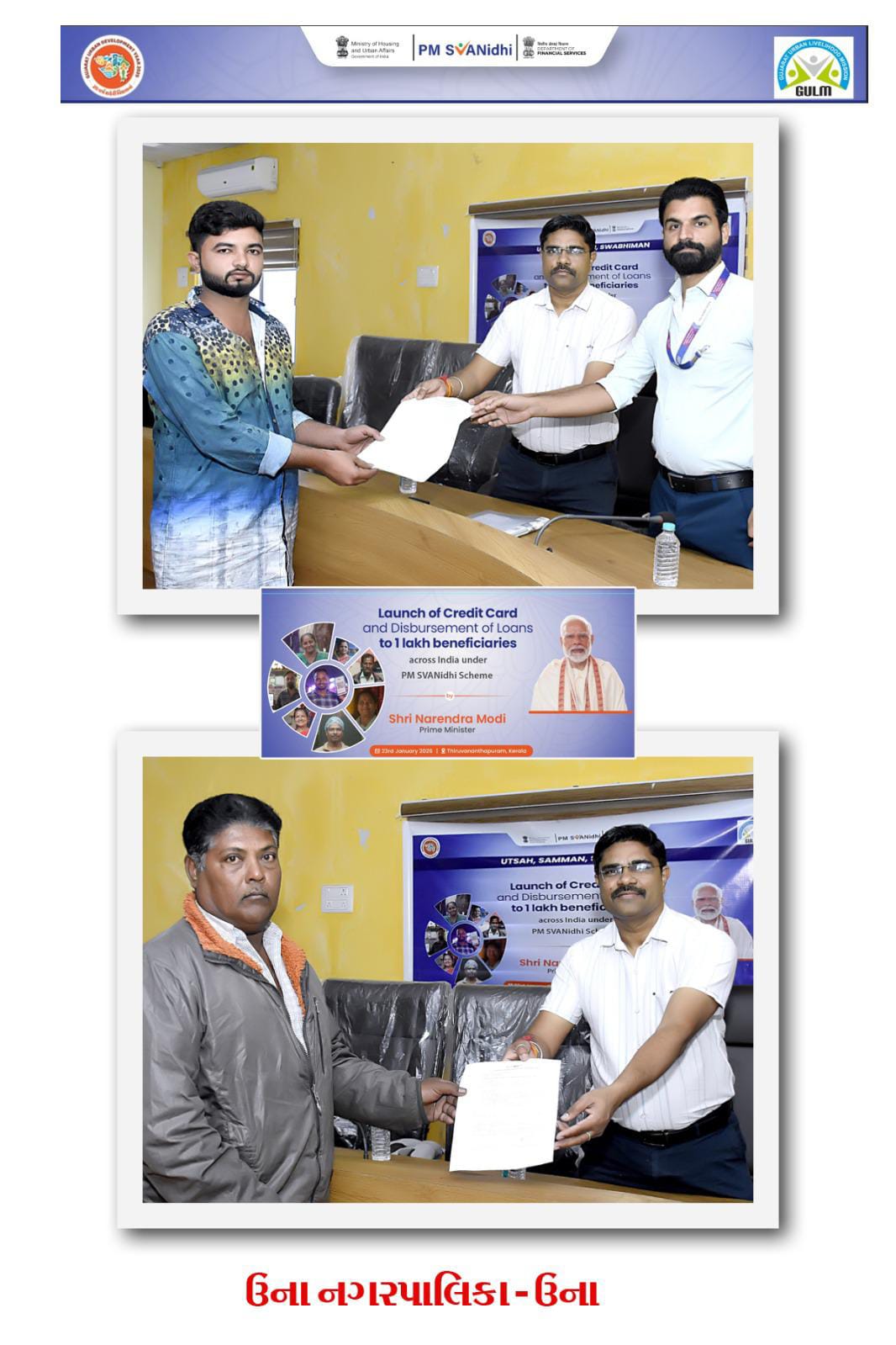 આ રાષ્ટ્રીય કાર્યક્રમને અનુરૂપ ગીર સોમનાથ જિલ્લાના ઊના નગરપાલિકા દ્વારા પણ નગરપાલિકા ભવન, ઊના ખાતે વિશેષ કાર્યક્રમનું આયોજન કરવામાં આવ્યું હતું. જેમાં પી.એમ. સ્વાનિધિ યોજનાના લાભાર્થીઓ એવા સ્ટ્રીટ વેન્ડરો અને નાના વેપારીઓને ₹૧૫,૦૦૦/-, ₹૨૫,૦૦૦/- તથા ₹૫૦,૦૦૦/-ની લોનના સેન્સન લેટર અને ચેકનું વિતરણ કરવામાં આવ્યું હતું.
