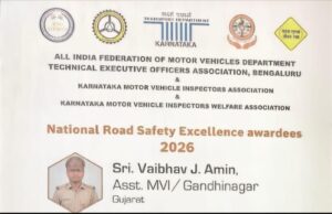 ઈડર શહેરના હોનહાર યુવાન અને નેશનલ રોડ સેફ્ટી ઓથોરિટી ઓફ ગુજરાત ગાંધીનગર ખાતે એન્ફોર્સમેન્ટ ઓફિસર તરીકે ફરજ બજાવતા વૈભવ જગદીશભાઈ અમીન (RTO ઓફિસર)ને તાજેતરમાં નેશનલ રોડ સેફ્ટી એક્સેલન્સ એવોર્ડ ૨૦૨૬થી સન્માનિત કરવામાં આવ્યા છે. સમગ્ર રાષ્ટ્રીય સ્તરે તેઓ પ્રથમ નંબર આ એવોર્ડ મેળવીને ગુજરાત તેમજ ઈડરનું નામ દેશભરમાં રોશન કર્યું છે.